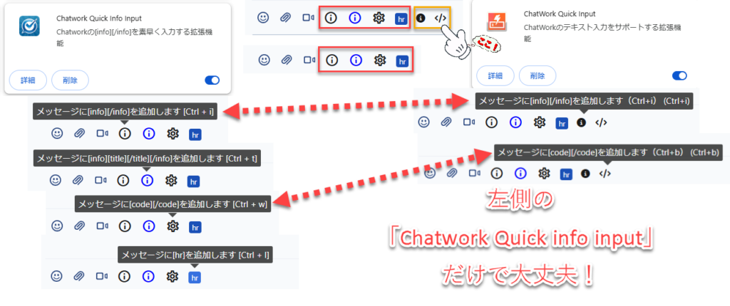 似た拡張機能に「❷ChatWork Quick Input」がありますが、❶>❷の関係で、❶を入れれば❷の機能も入っていますので、「❶Chatwork Quick Info Input」だけで大丈夫です。