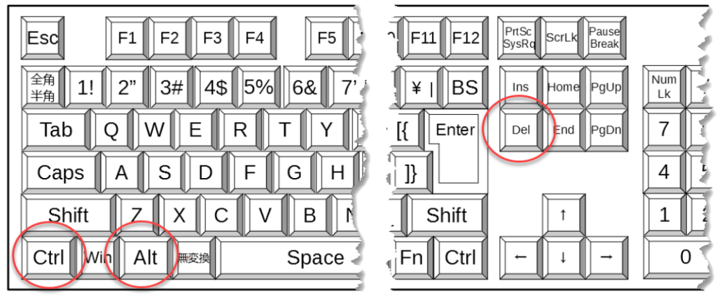 左手の中指で「Ctrlキー」、人指し指で「Altキー」を押す