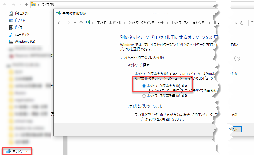 作業:PC-Bの共有の詳細設定で「ネットワーク検索を有効にする」