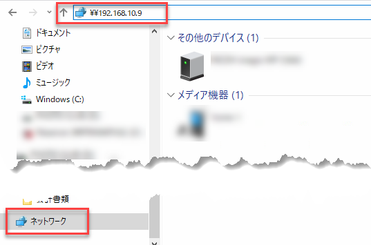 その1:「ネットワーク」のアドレス欄にPC-AのIPアドレス「\\192.168.10.9」を入力