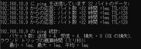 PC-Bのパソコンのコマンドプロンプト:> ping 192.168.10.9