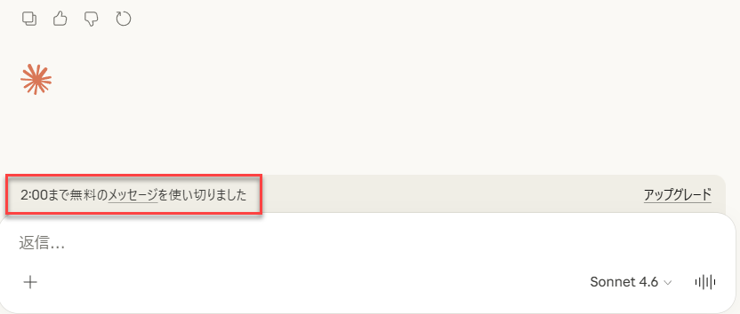 Claudeの場合は、制限に達するとこんなメッセージが表示されます。